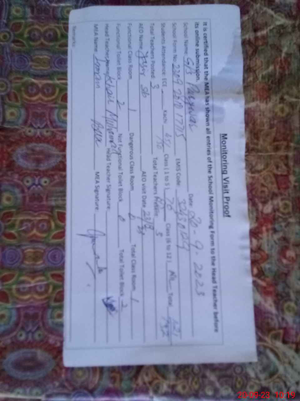 | Attendance Register | Head Teacher | MEA with School | Visit Proof |