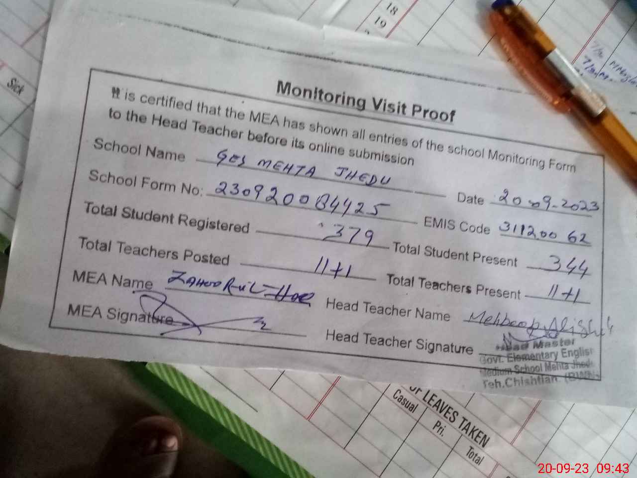 | Attendance Register | Head Teacher | MEA with School | Visit Proof |