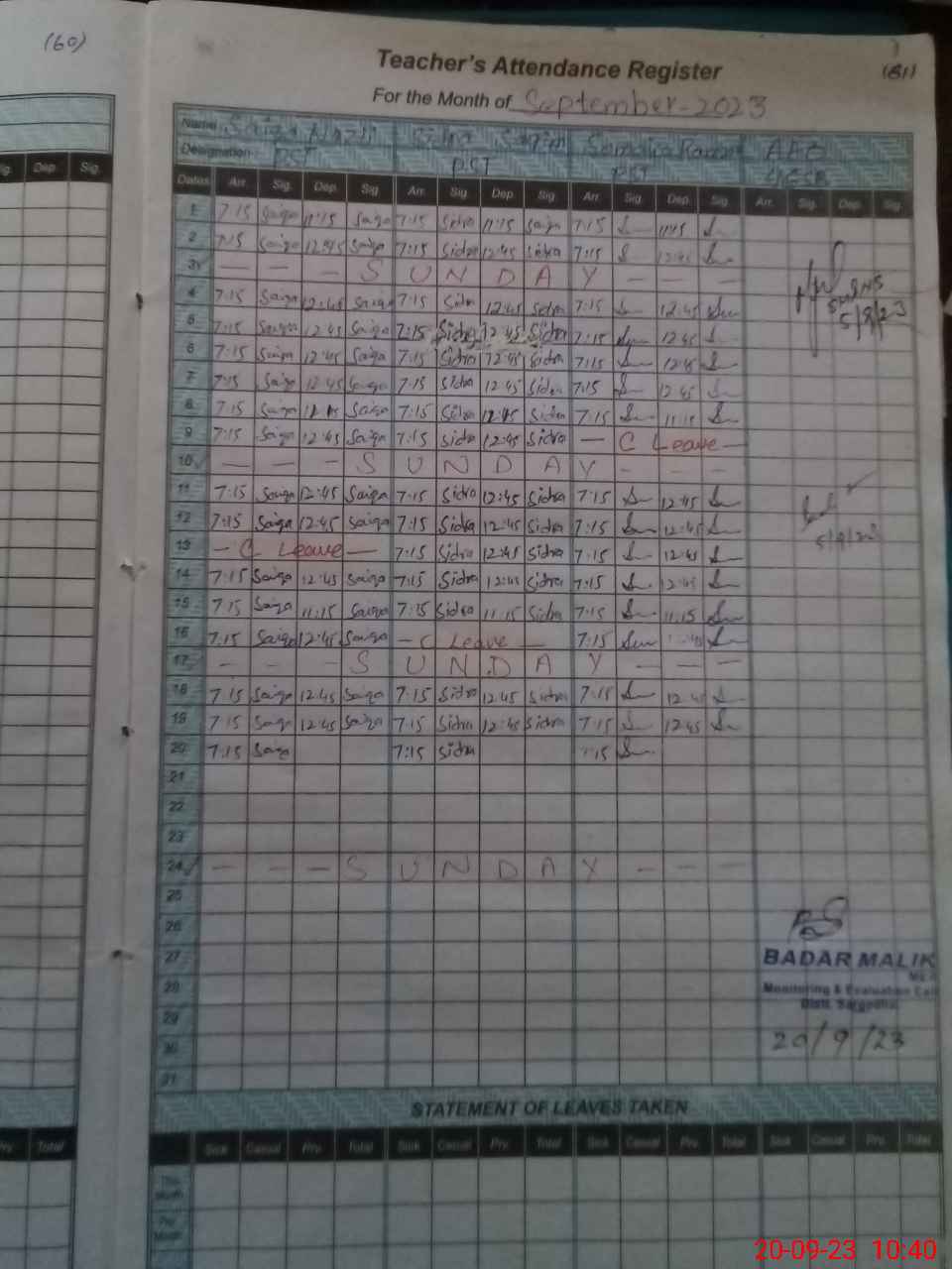 | Name: Si**** Sa**** Designation: (School Headmaster's/Headmistress's) PST Phone/Cell Number: 03**** |