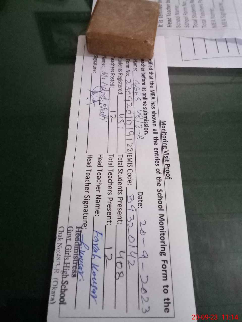 | Attendance Register | Head Teacher | MEA with School | Visit Proof |