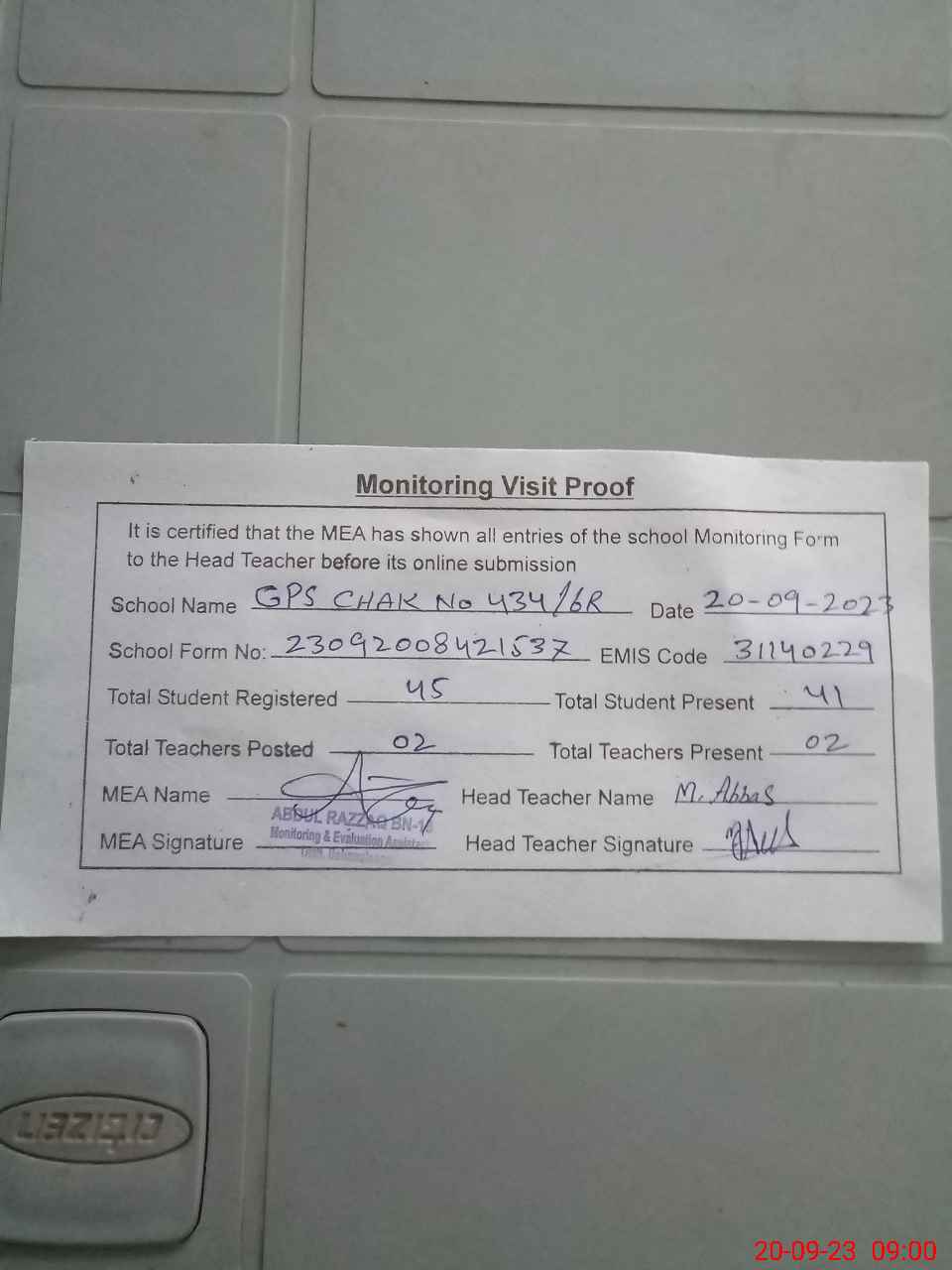 | Attendance Register | Head Teacher | MEA with School | Visit Proof |