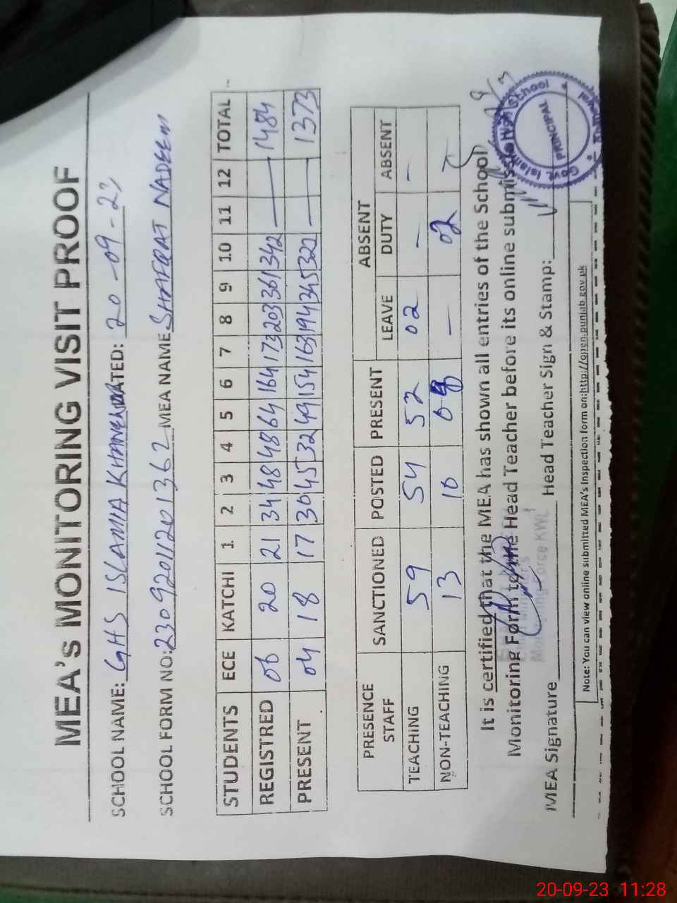 | Attendance Register | Head Teacher | MEA with School | Visit Proof |