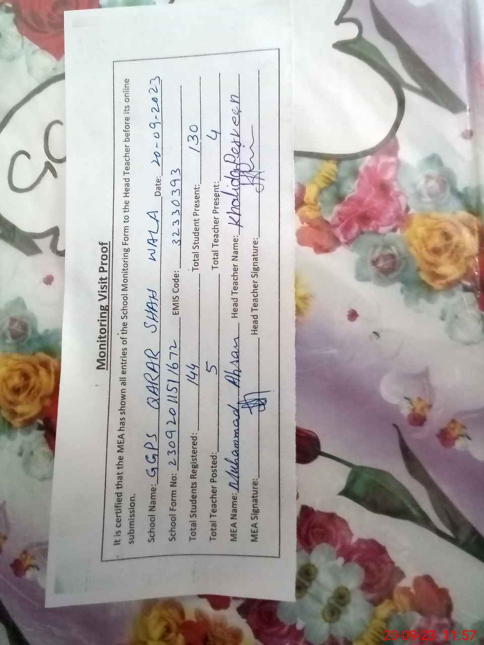 | Attendance Register | Head Teacher | MEA with School | Visit Proof |