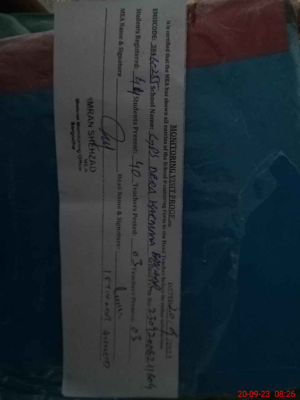 | Attendance Register | Head Teacher | MEA with School | Visit Proof |