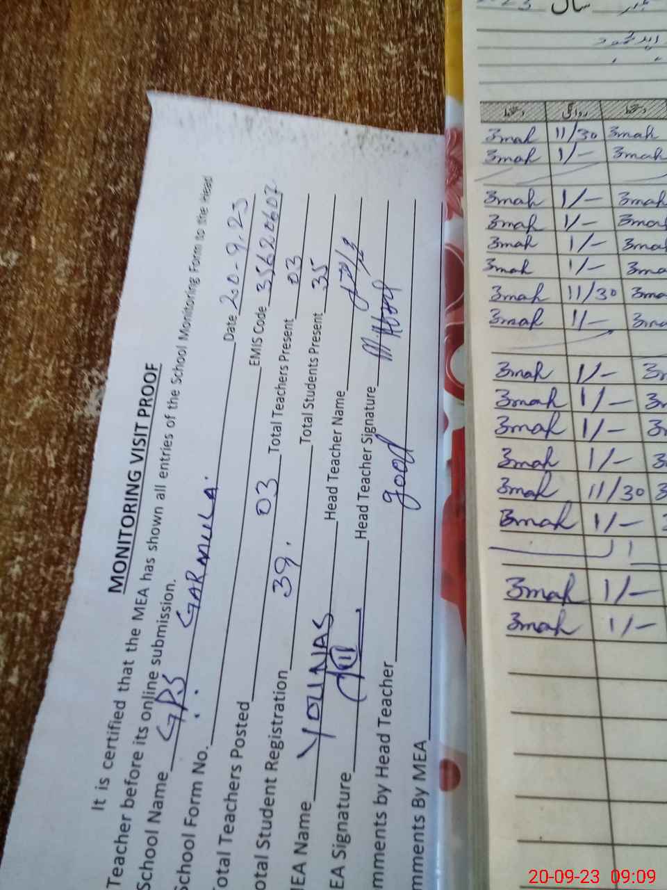 | Attendance Register | Head Teacher | MEA with School | Visit Proof |