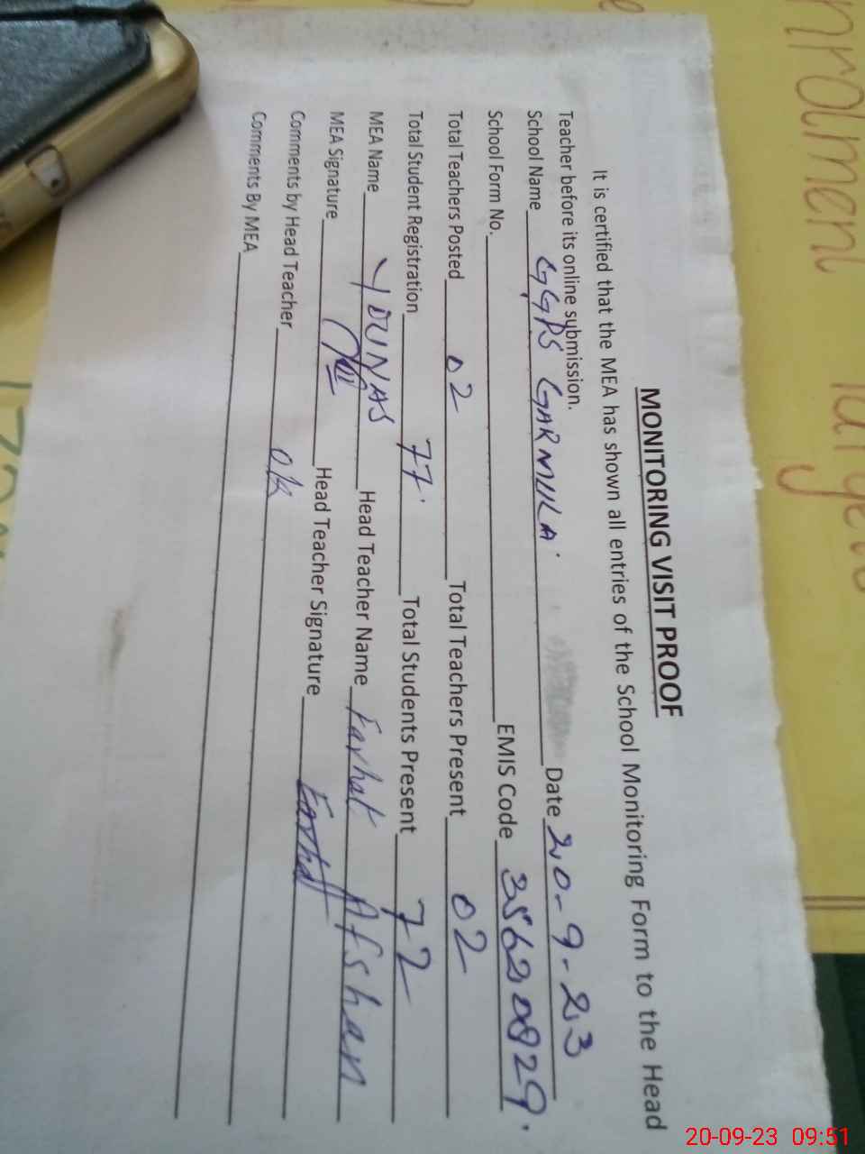 | Attendance Register | Head Teacher | MEA with School | Visit Proof |