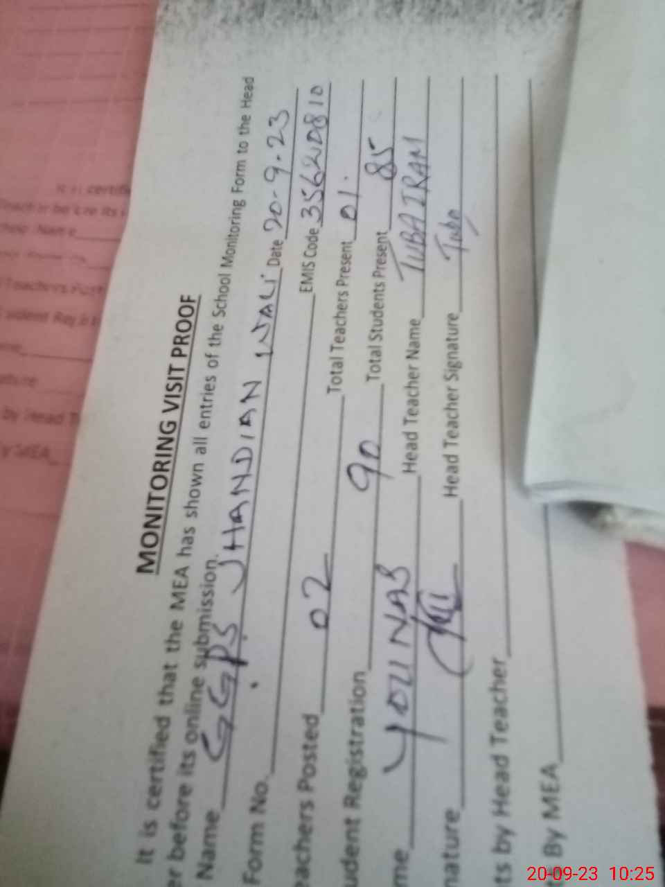 | Attendance Register | Head Teacher | MEA with School | Visit Proof |