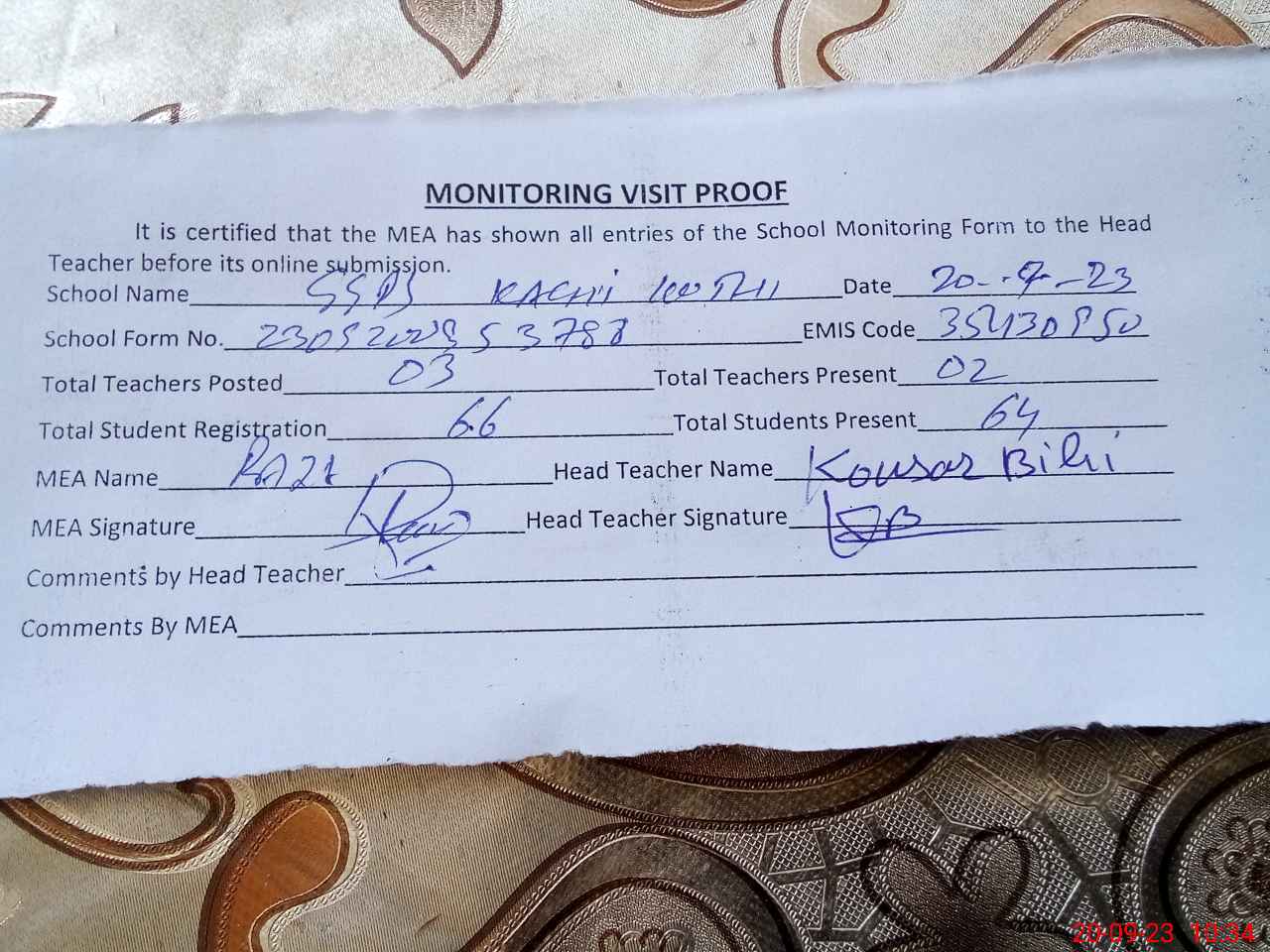 | Attendance Register | Head Teacher | MEA with School | Visit Proof |