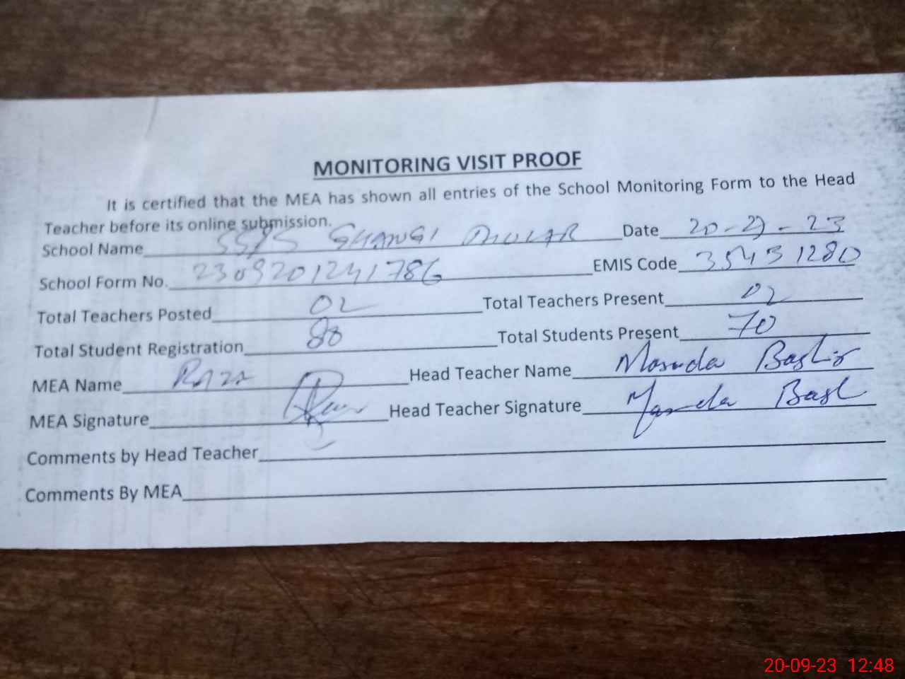 | Attendance Register | Head Teacher | MEA with School | Visit Proof |