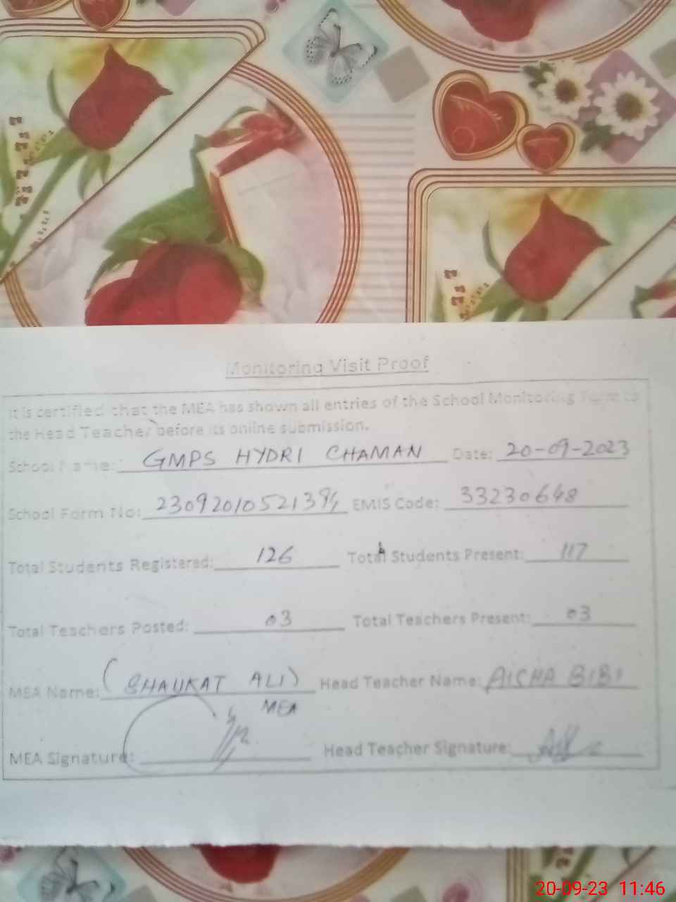 | EMIS Code: 33230648 | Name of School: GMPS HAYDRI CHAMAN | |||