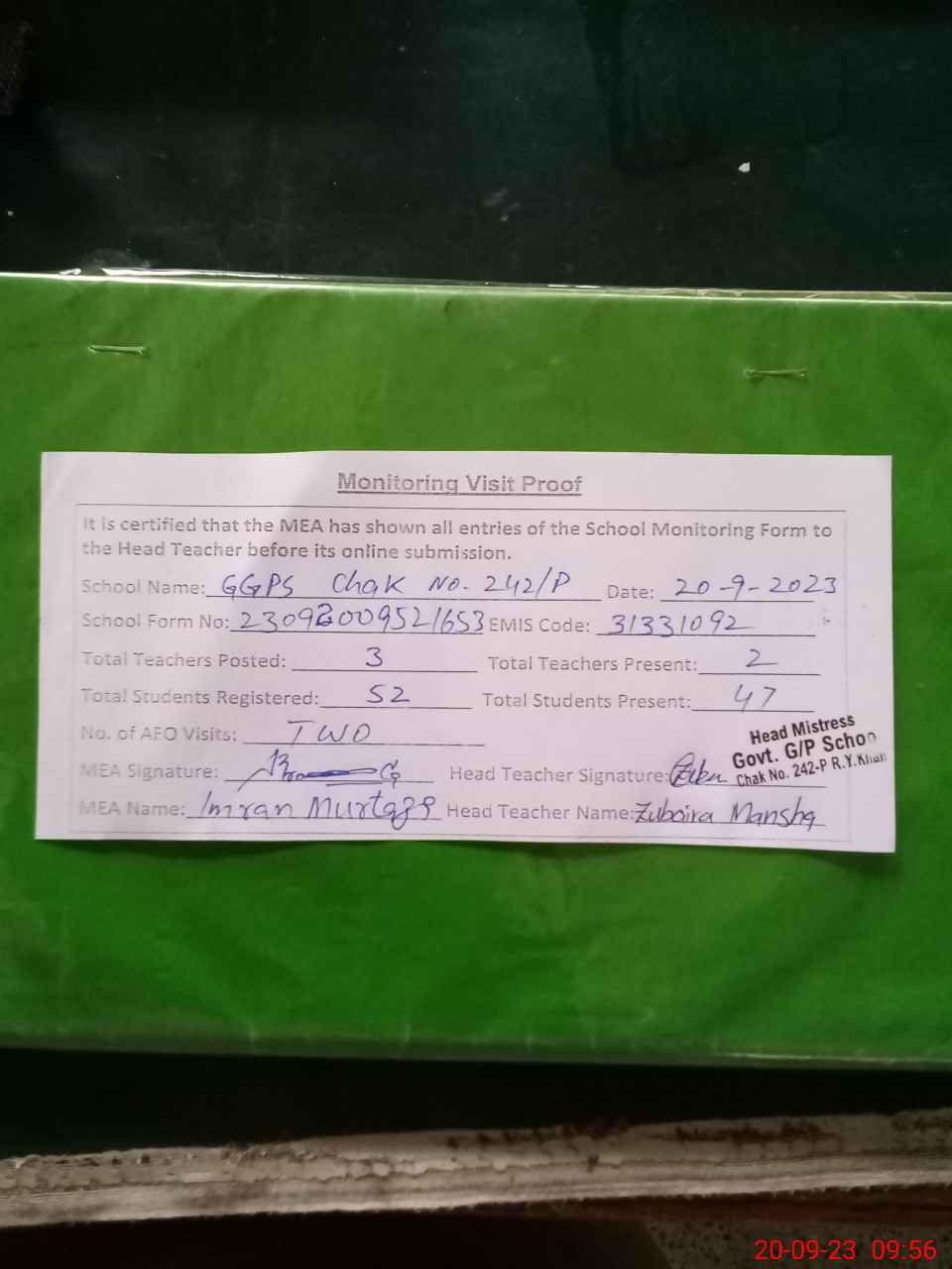 | Attendance Register | Head Teacher | MEA with School | Visit Proof |