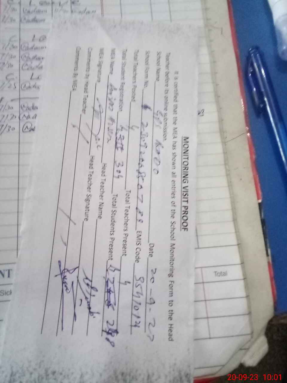 | Attendance Register | Head Teacher | MEA with School | Visit Proof |