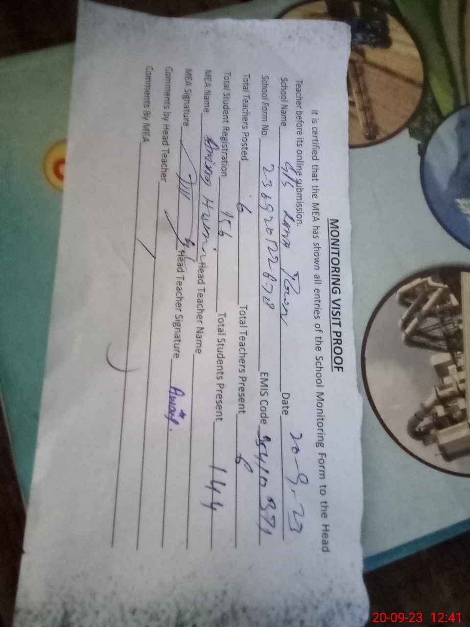 | Attendance Register | Head Teacher | MEA with School | Visit Proof |