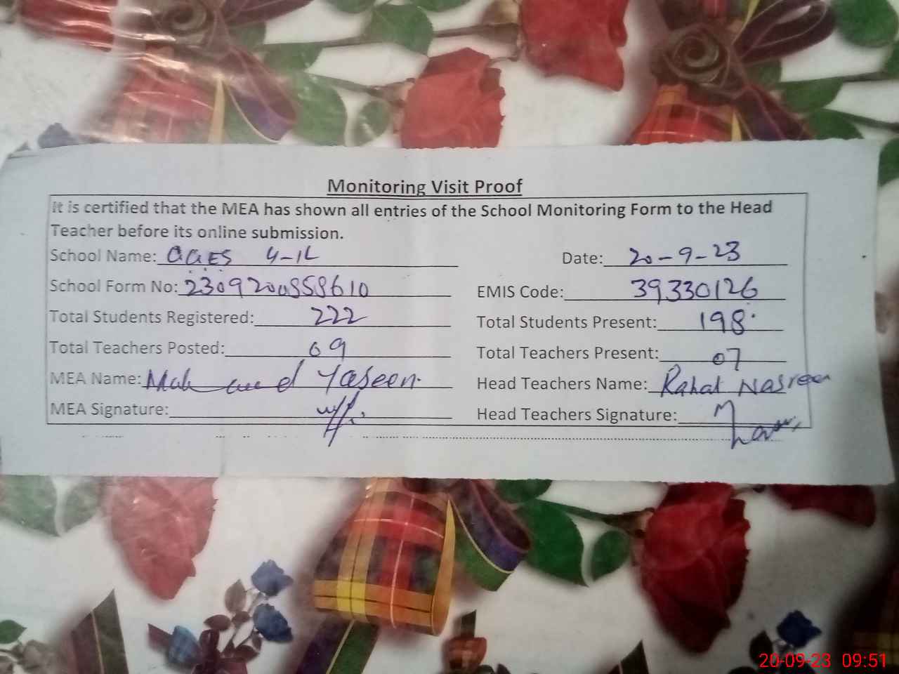 | Attendance Register | Head Teacher | MEA with School | Visit Proof |