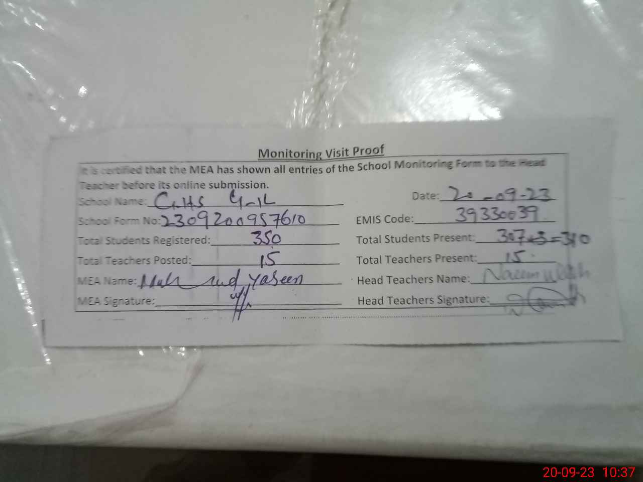 | Attendance Register | Head Teacher | MEA with School | Visit Proof |