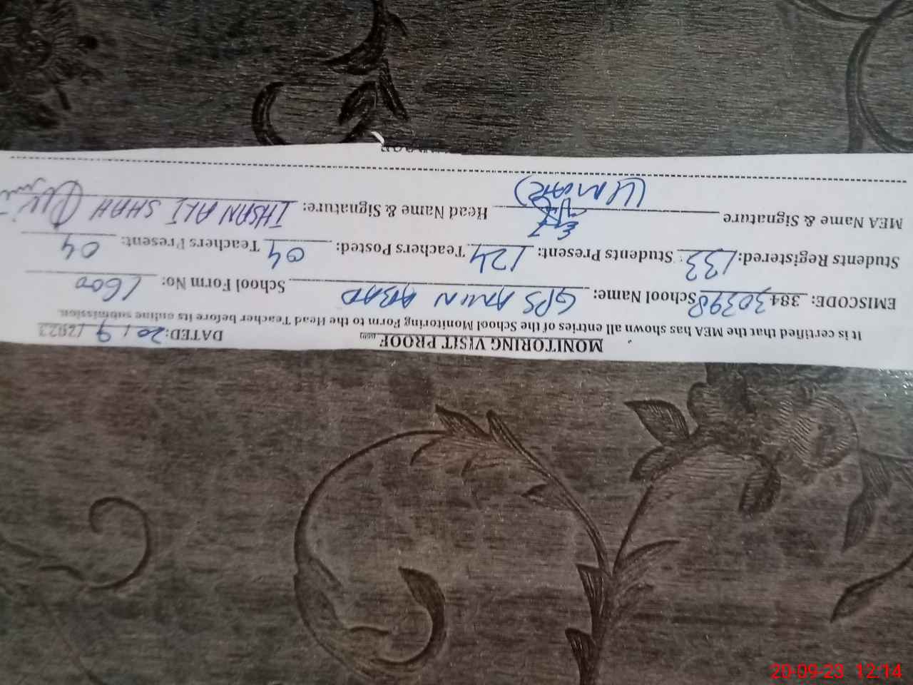 | Attendance Register | Head Teacher | MEA with School | Visit Proof |