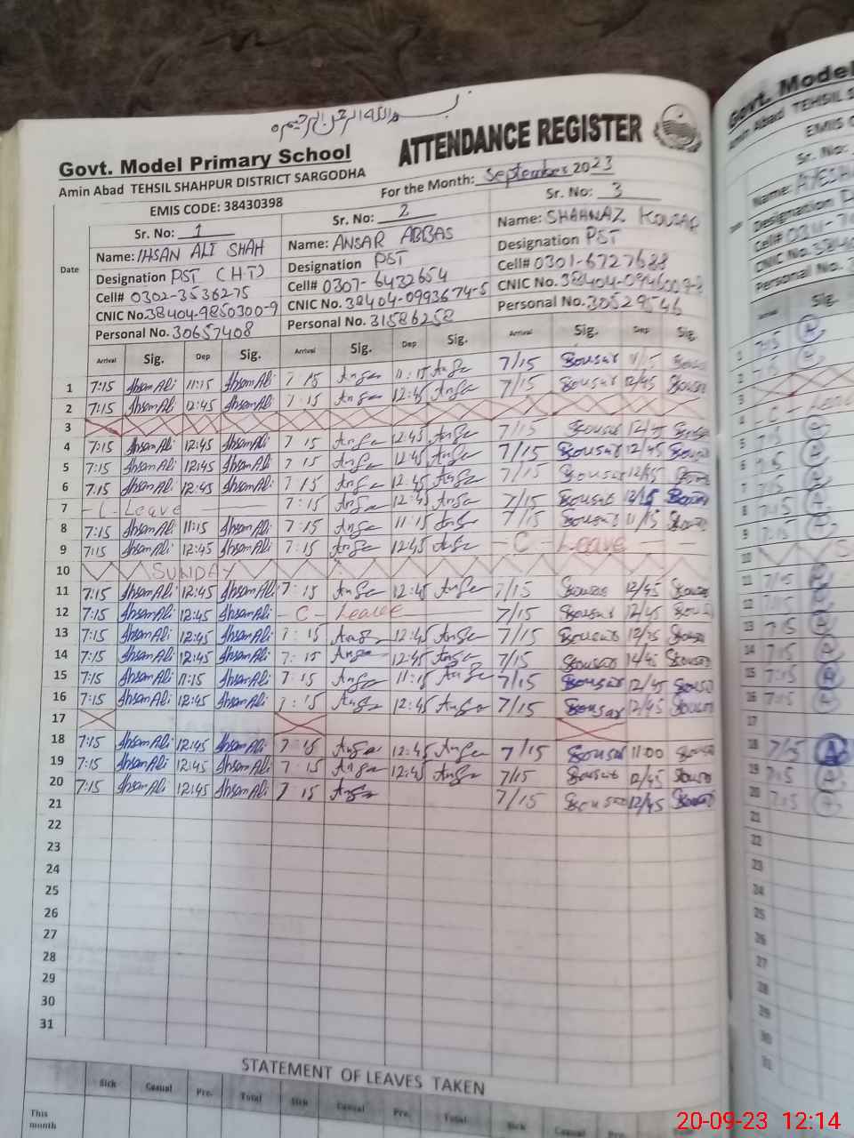 | Name: IH**** AL**** SH**** Designation: (School Headmaster's/Headmistress's) PST Phone/Cell Number: 03**** |