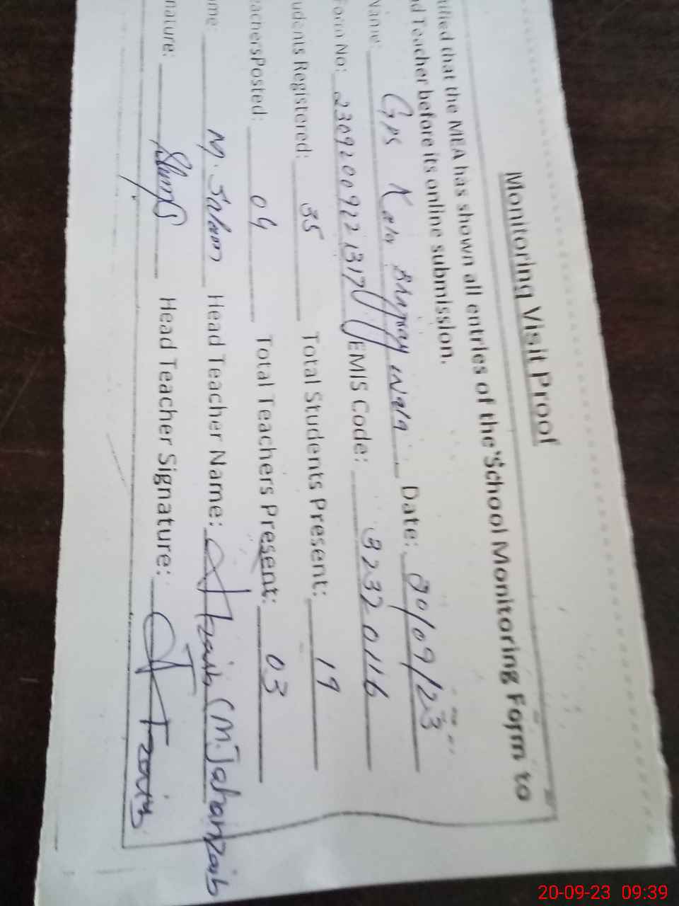 | Attendance Register | Head Teacher | MEA with School | Visit Proof |