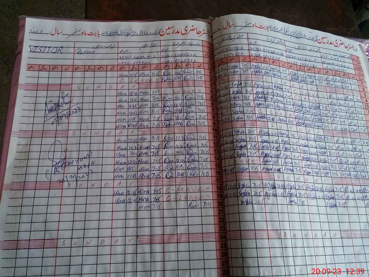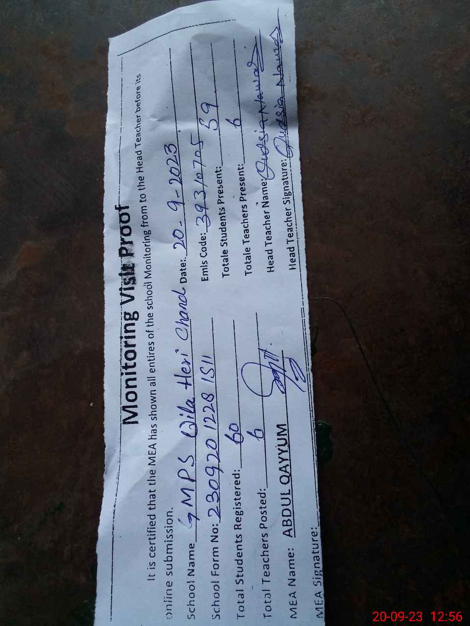 | Attendance Register | Head Teacher | MEA with School | Visit Proof |