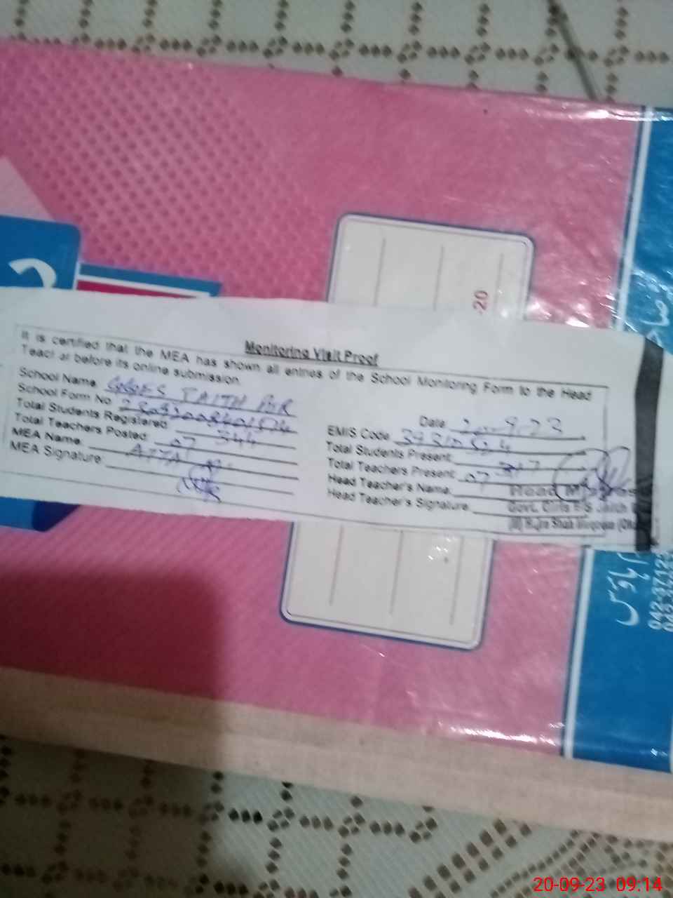 | Attendance Register | Head Teacher | MEA with School | Visit Proof |