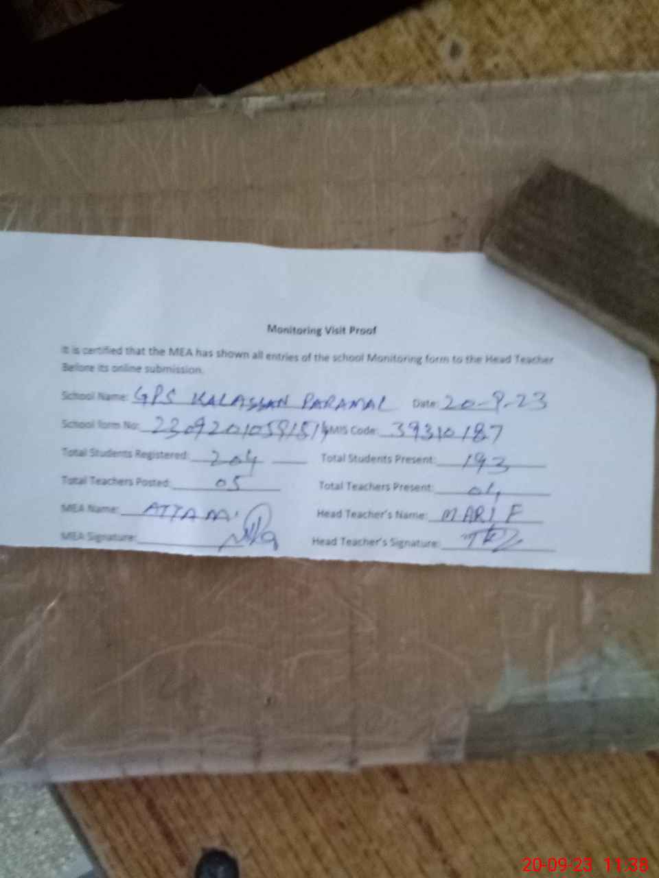 | Attendance Register | Head Teacher | MEA with School | Visit Proof |