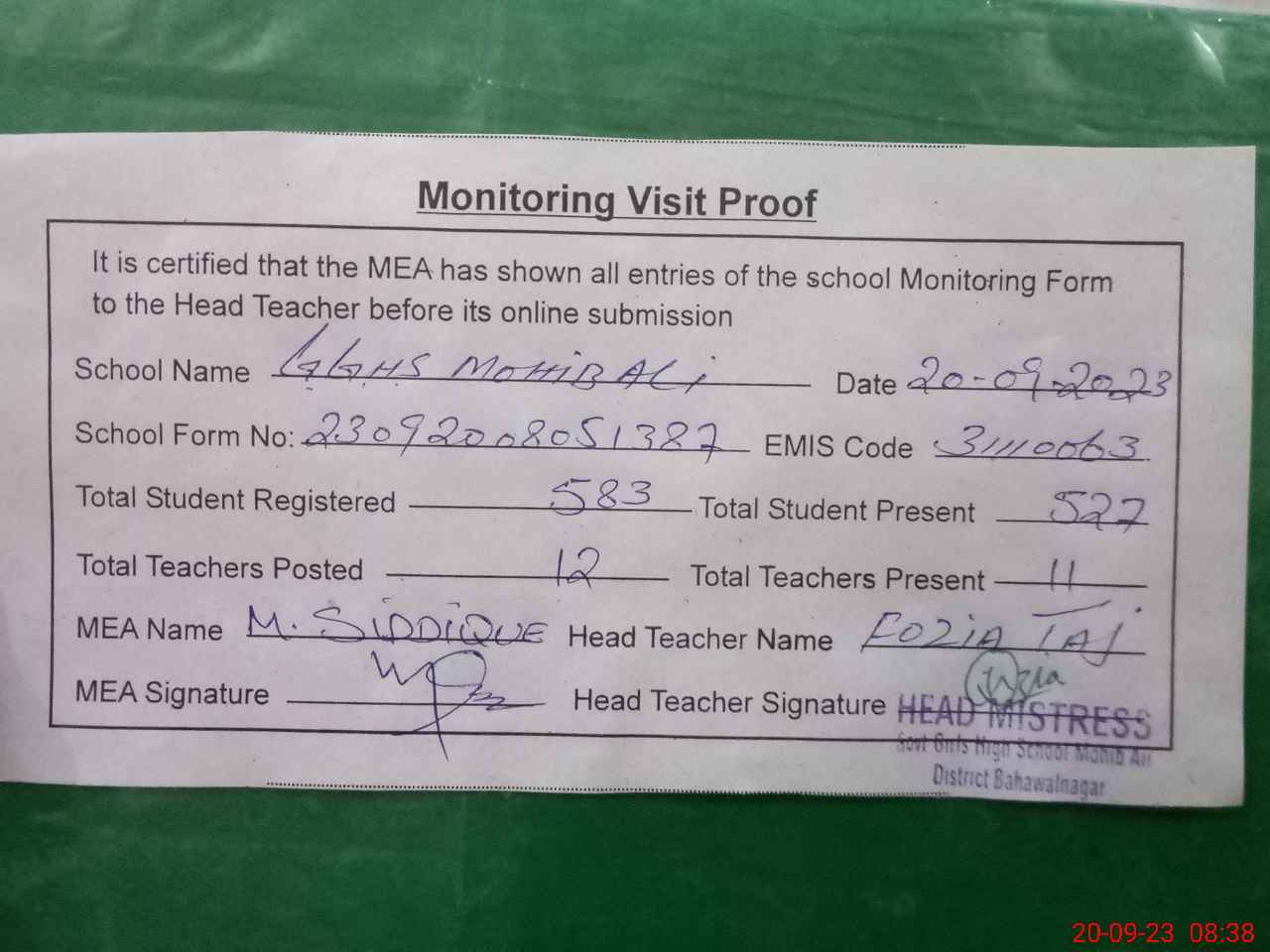 | Attendance Register | Head Teacher | MEA with School | Visit Proof |