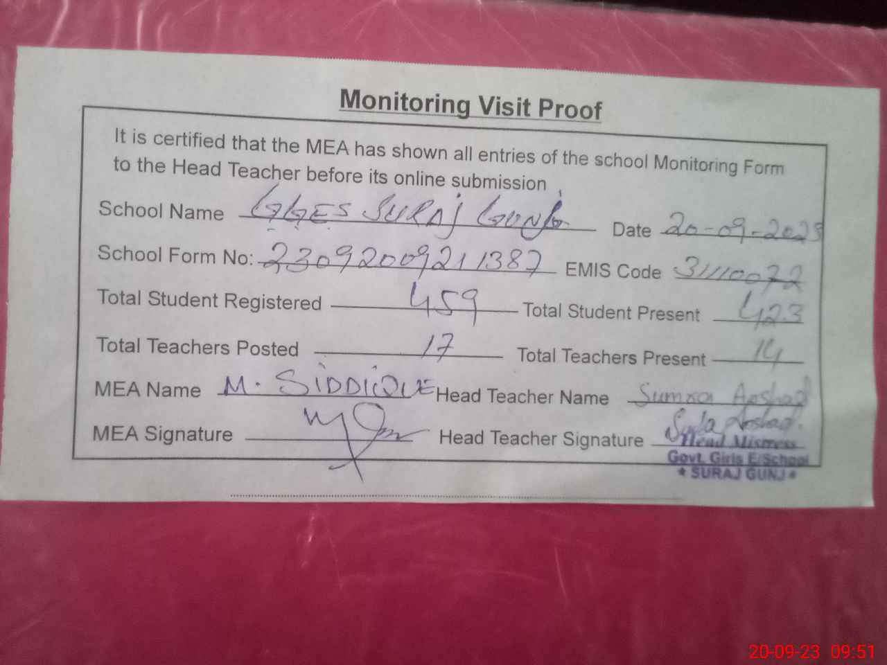 | EMIS Code: 31110072 | Name of School: GGES SURUJ GUNJ | |||