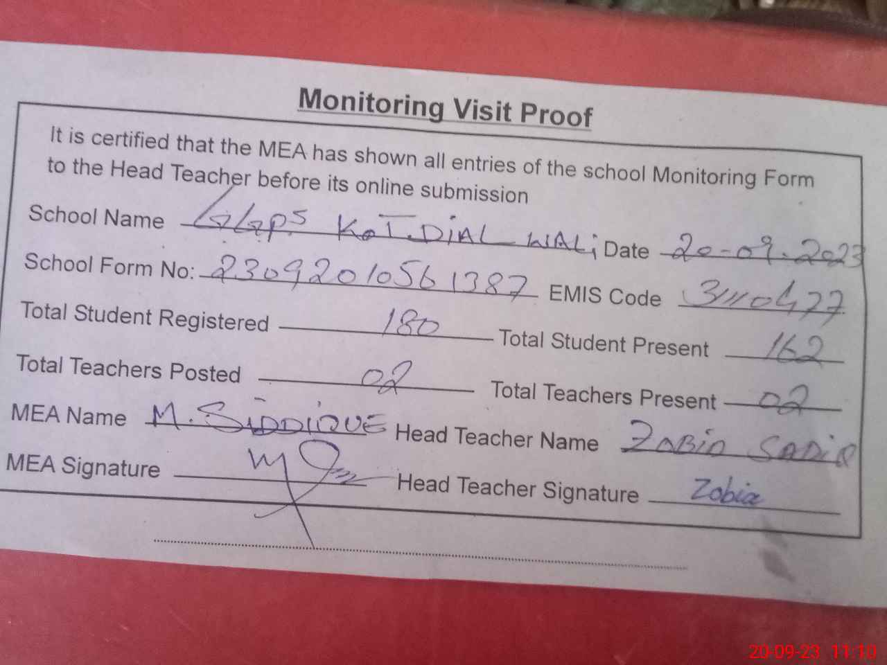 | Attendance Register | Head Teacher | MEA with School | Visit Proof |