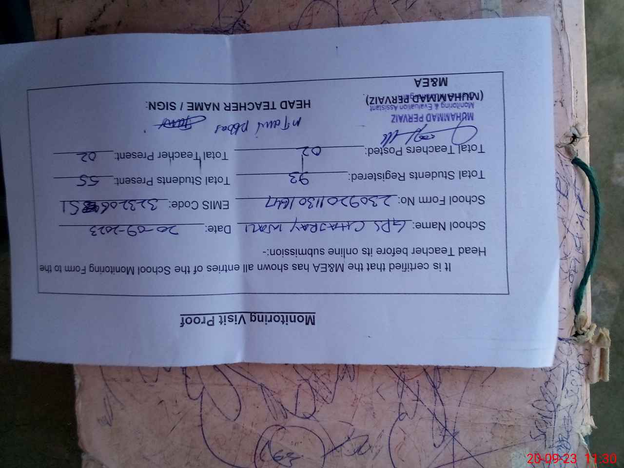 | EMIS Code: 32320651 | Name of School: GPS CHAJRAY WALI | |||