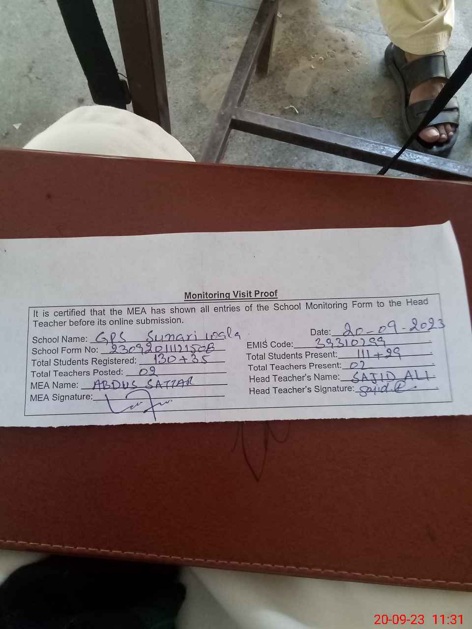 | Attendance Register | Head Teacher | MEA with School | Visit Proof |
