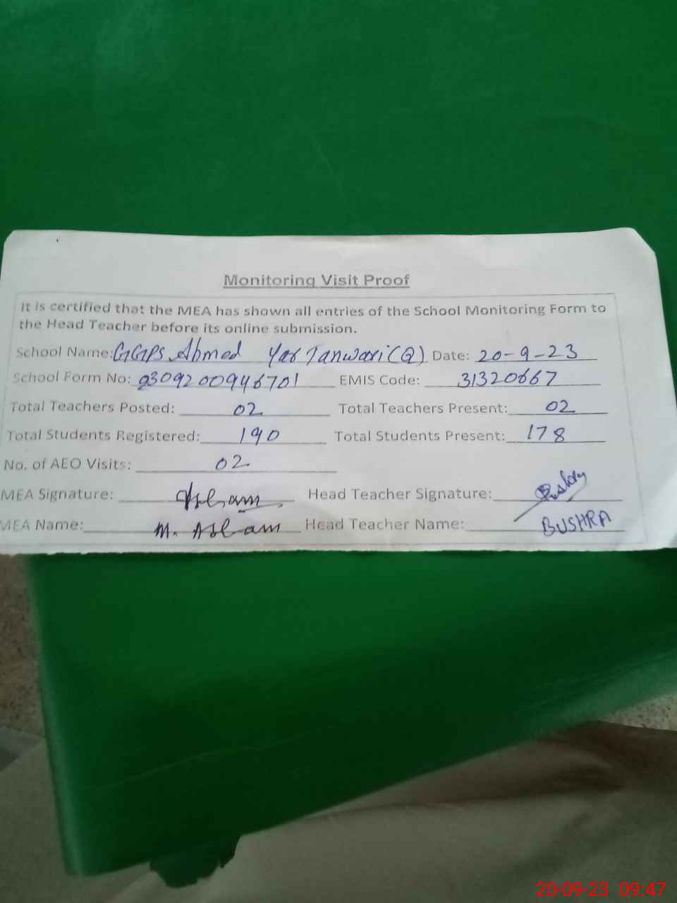 | Attendance Register | Head Teacher | MEA with School | Visit Proof |