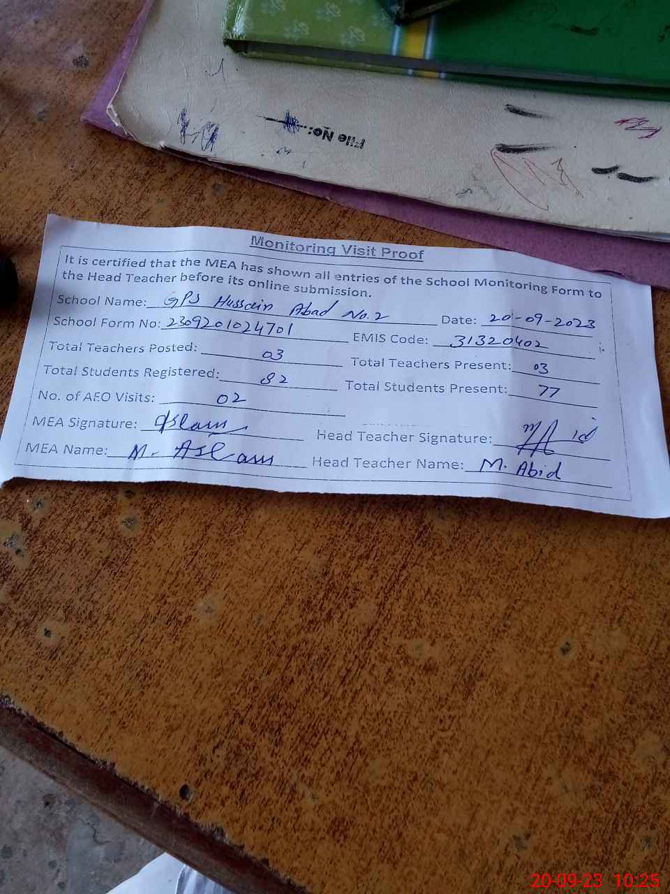 | Attendance Register | Head Teacher | MEA with School | Visit Proof |