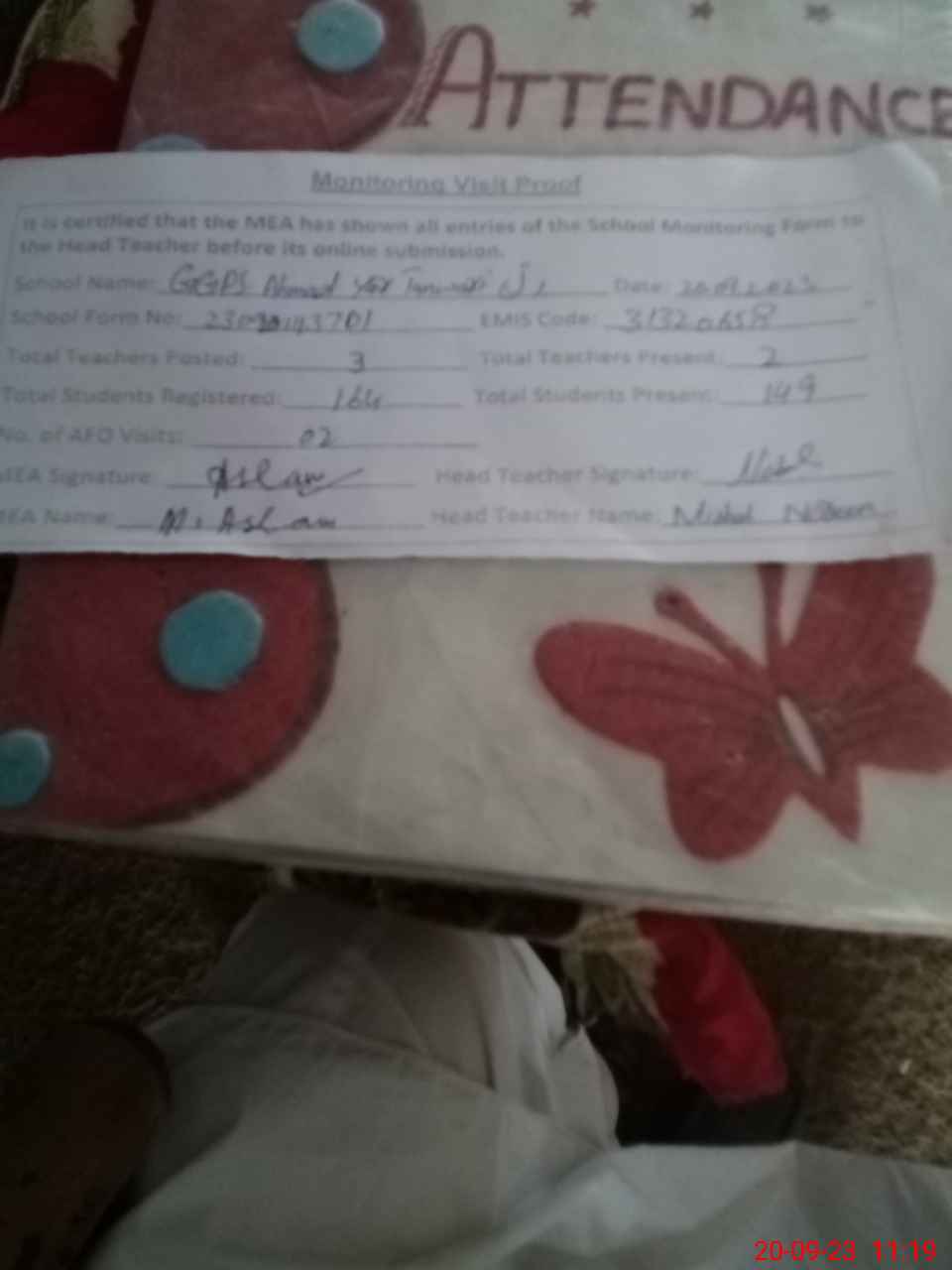 | Attendance Register | Head Teacher | MEA with School | Visit Proof |