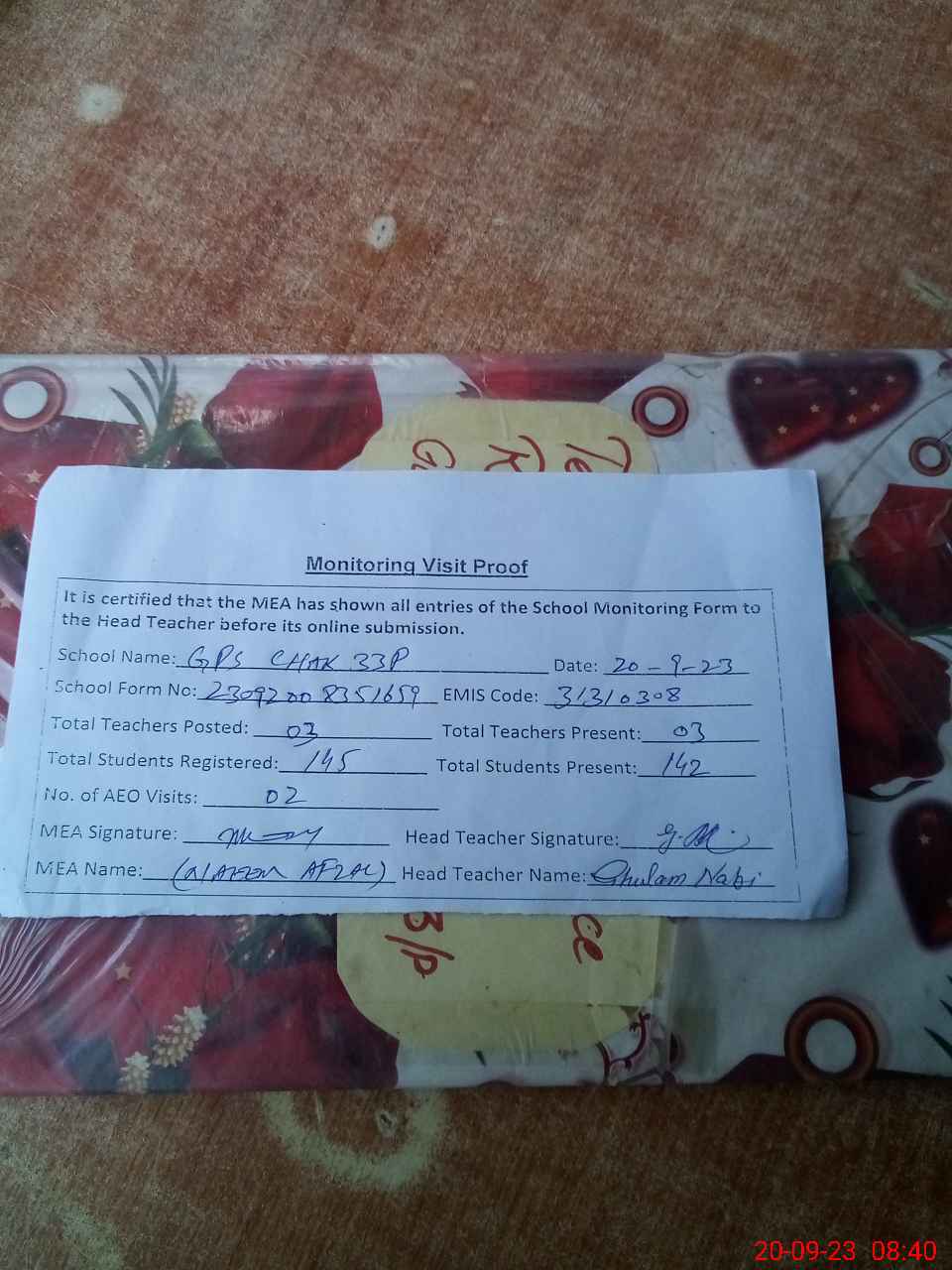 | Attendance Register | Head Teacher | MEA with School | Visit Proof |