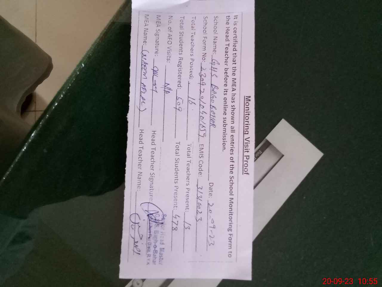 | Attendance Register | Head Teacher | MEA with School | Visit Proof |