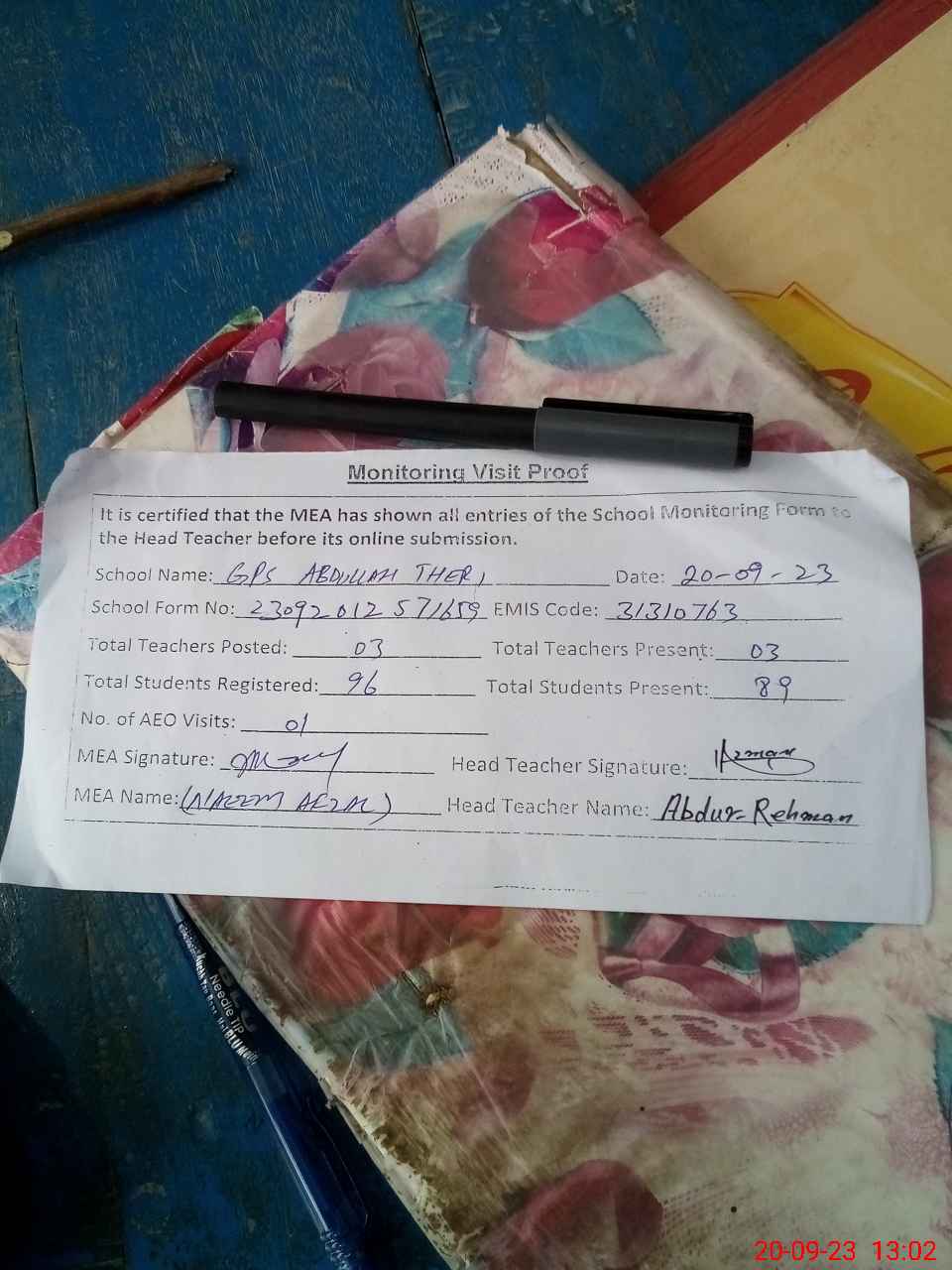 | Attendance Register | Head Teacher | MEA with School | Visit Proof |