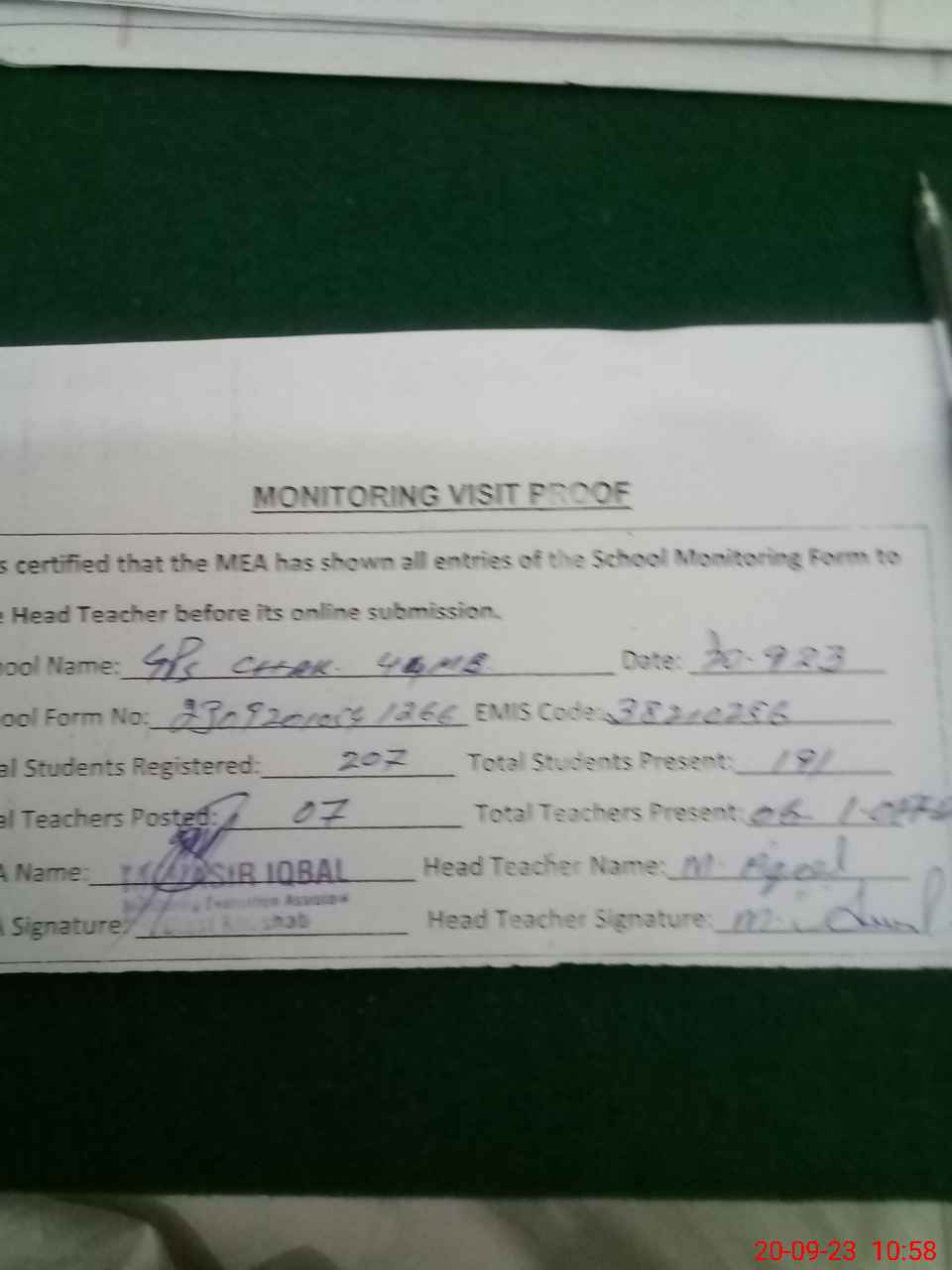 | Attendance Register | Head Teacher | MEA with School | Visit Proof |