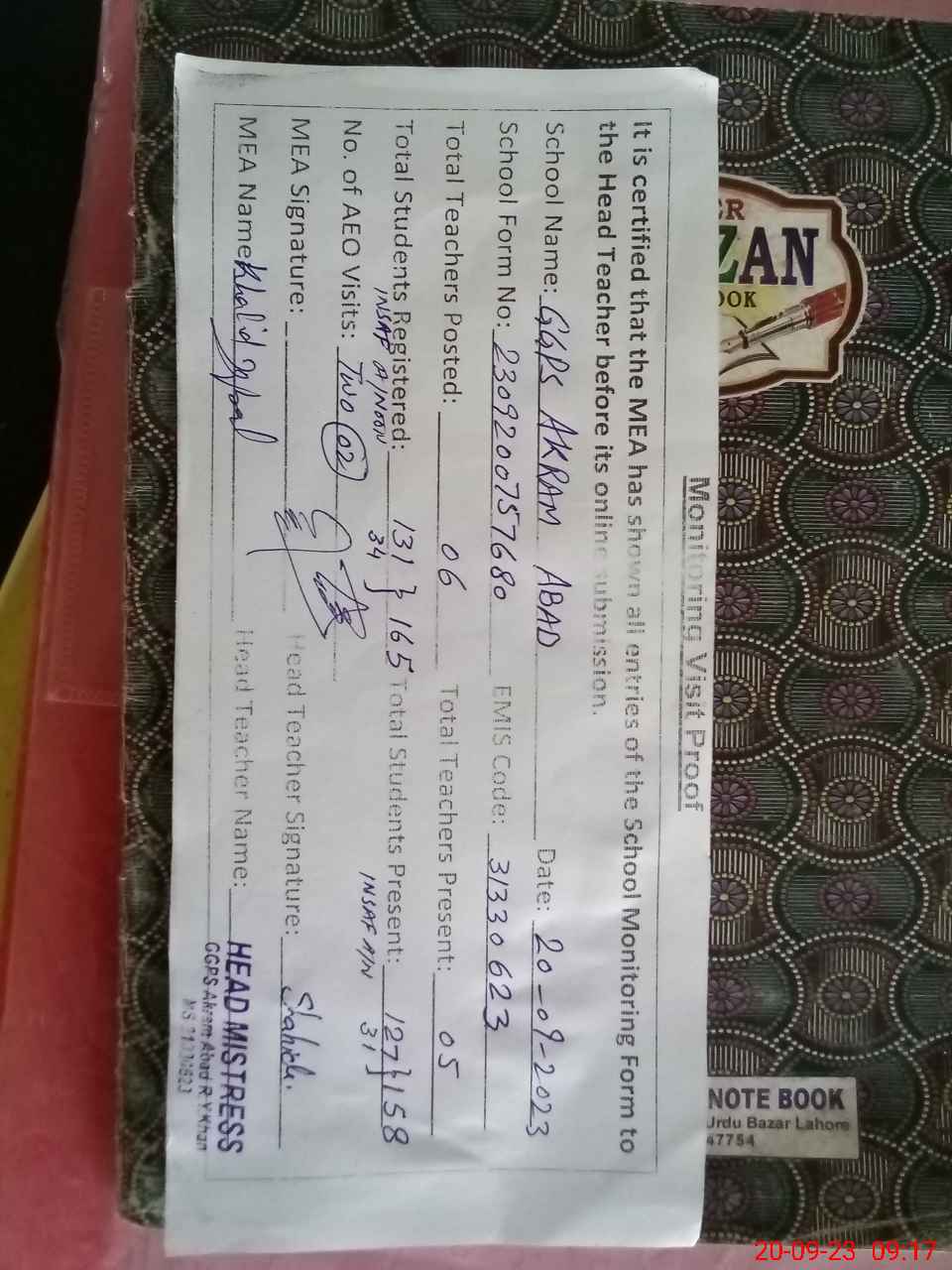 | Attendance Register | Head Teacher | MEA with School | Visit Proof |