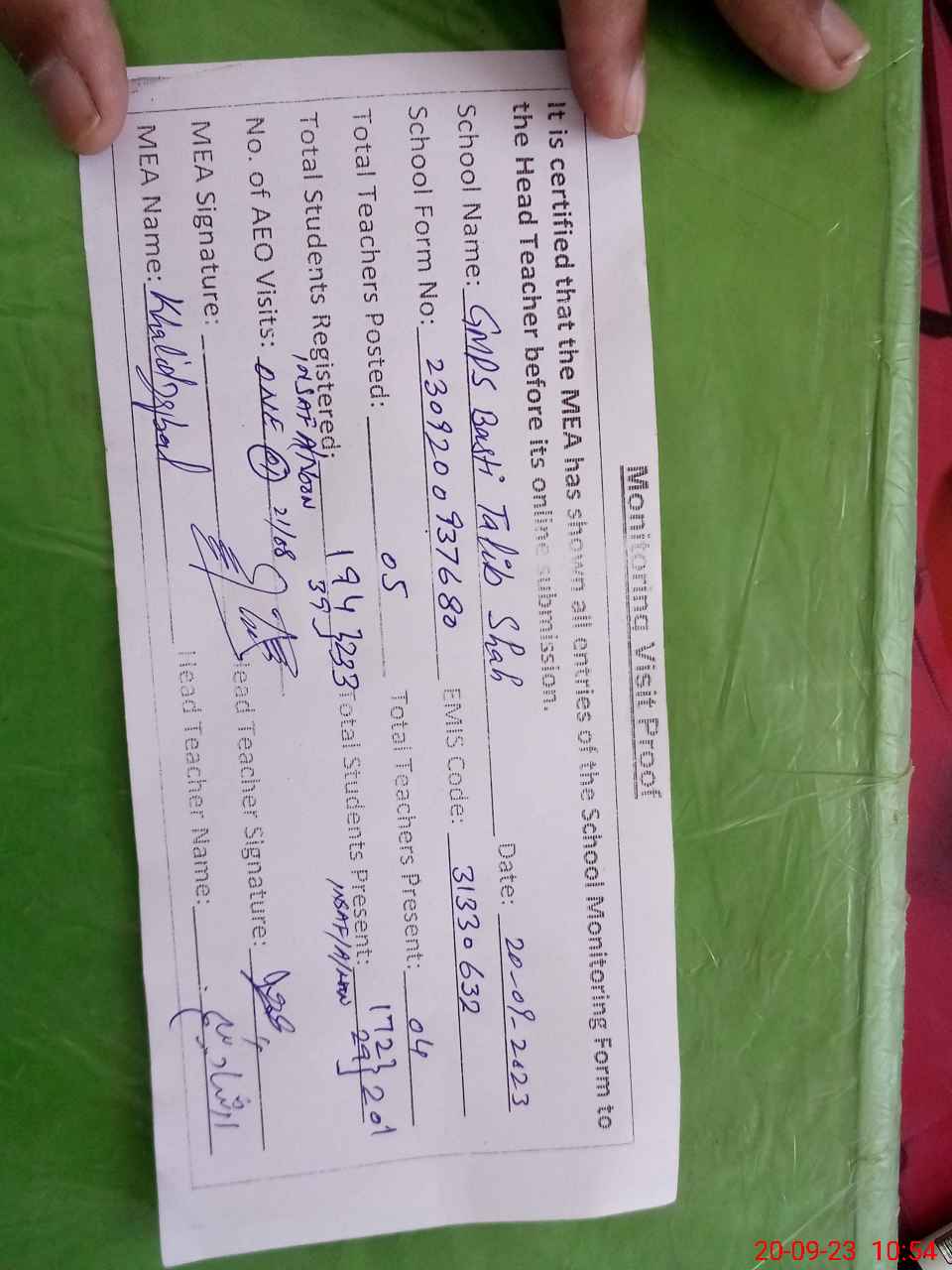 | EMIS Code: 31330632 | Name of School: GMPS BASTI TALIB SHAH | |||