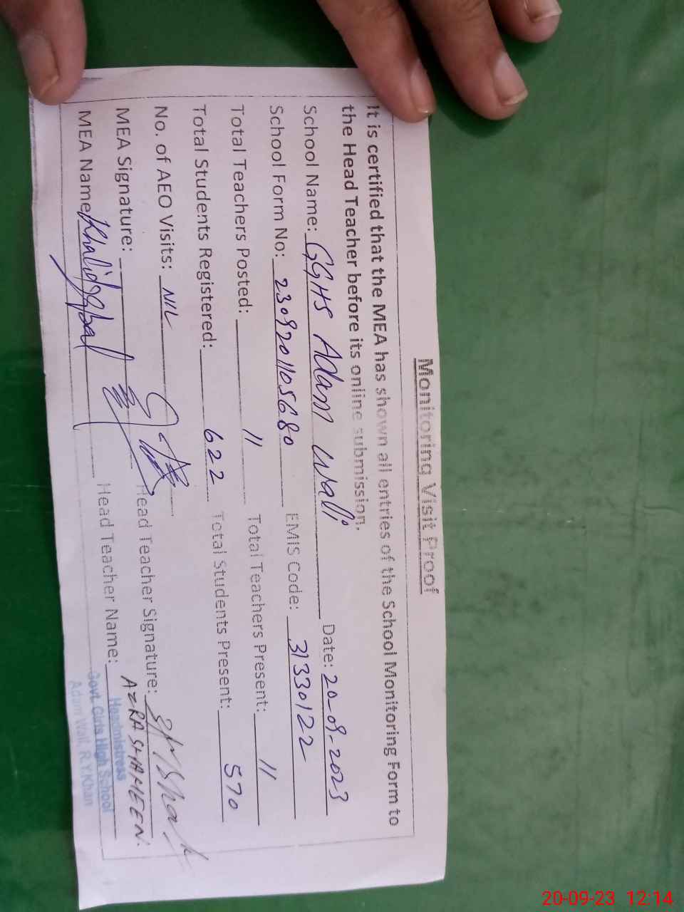| EMIS Code: 31330122 | Name of School: GGHS ADAM WALI | |||