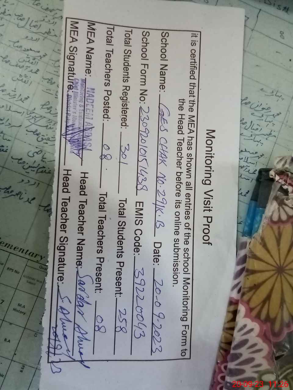 | EMIS Code: 39220043 | Name of School: GES CHAK NO. 29 KB | |||