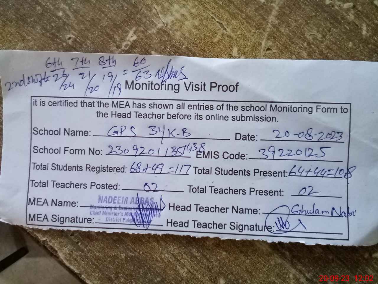 | Attendance Register | Head Teacher | MEA with School | Visit Proof |
