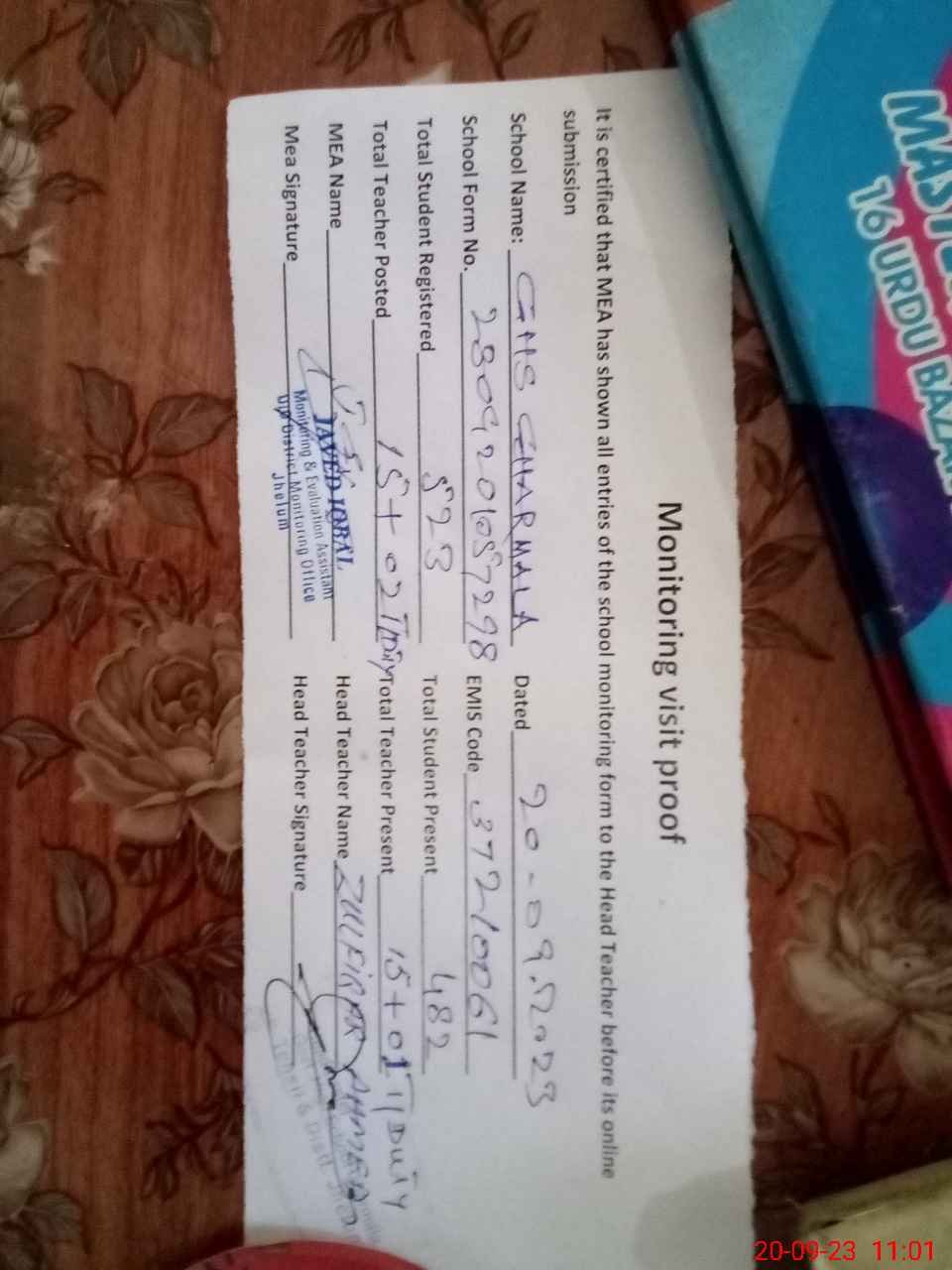 | Attendance Register | Head Teacher | MEA with School | Visit Proof |