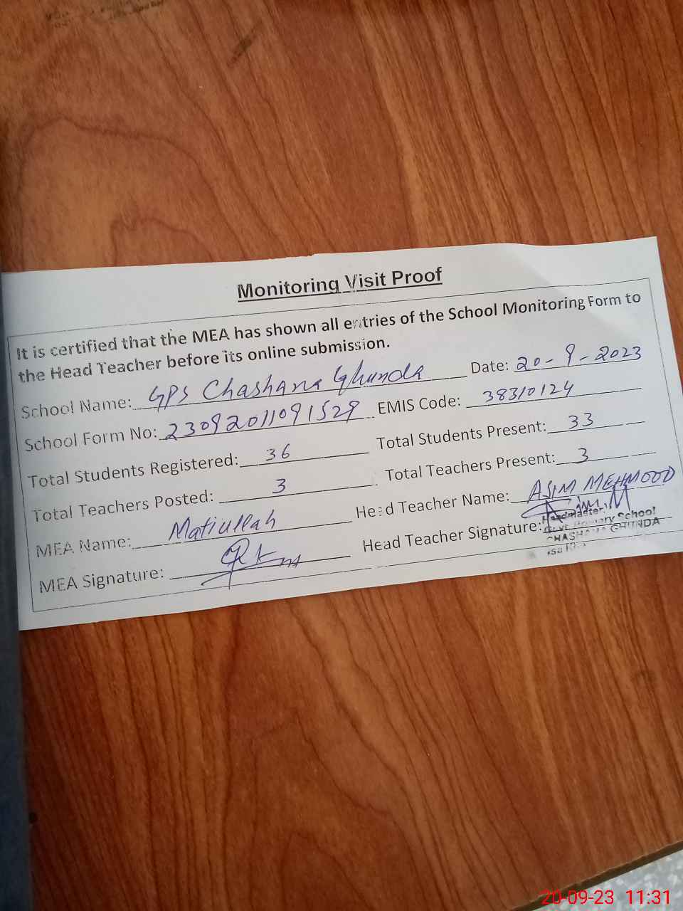 | Attendance Register | Head Teacher | MEA with School | Visit Proof |
