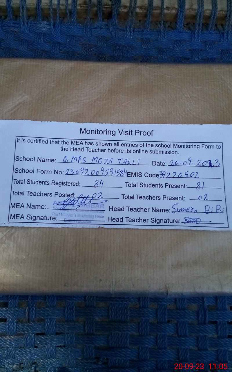 | EMIS Code: 39220502 | Name of School: GMPS MOZA TALLI | |||