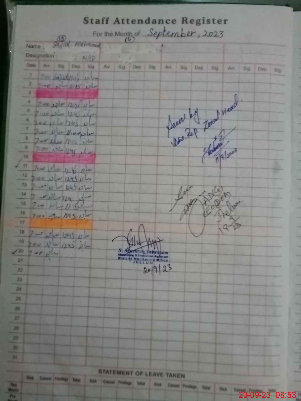 | Monitoring Date: 20-09-2023 | Start Time: 20-09-2023 08:10 AM | End Time: 20-09-2023 08:58 AM | Name of MEA: Sh**** Mu**** Ta**** | |