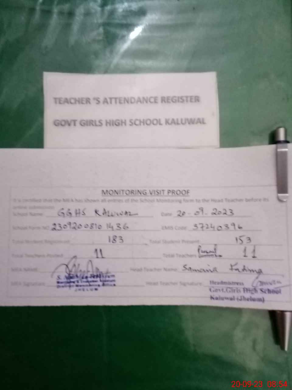| Attendance Register | Head Teacher | MEA with School | Visit Proof |