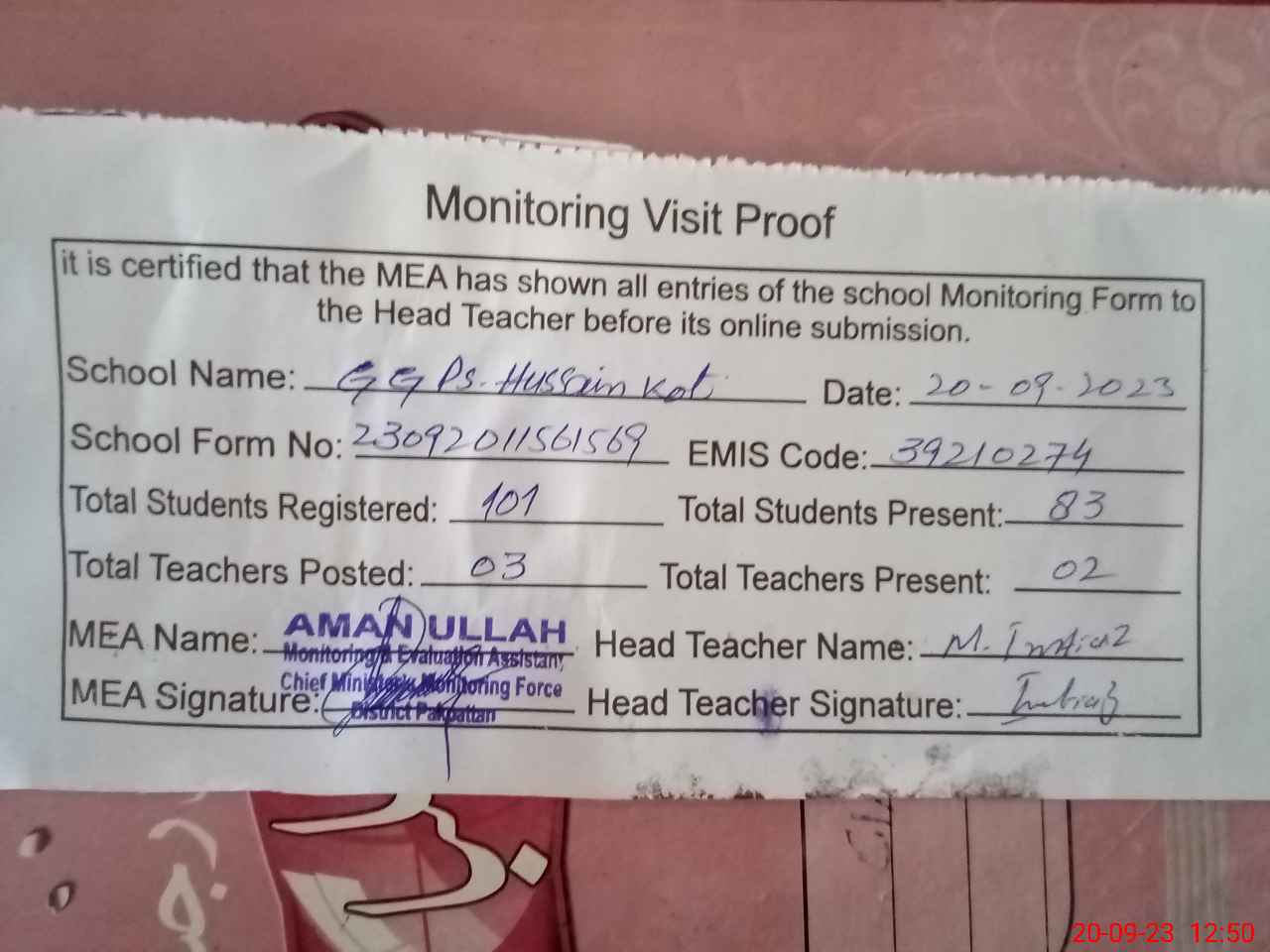 | EMIS Code: 39210274 | Name of School: GPS HUSSAIN KOT | |||