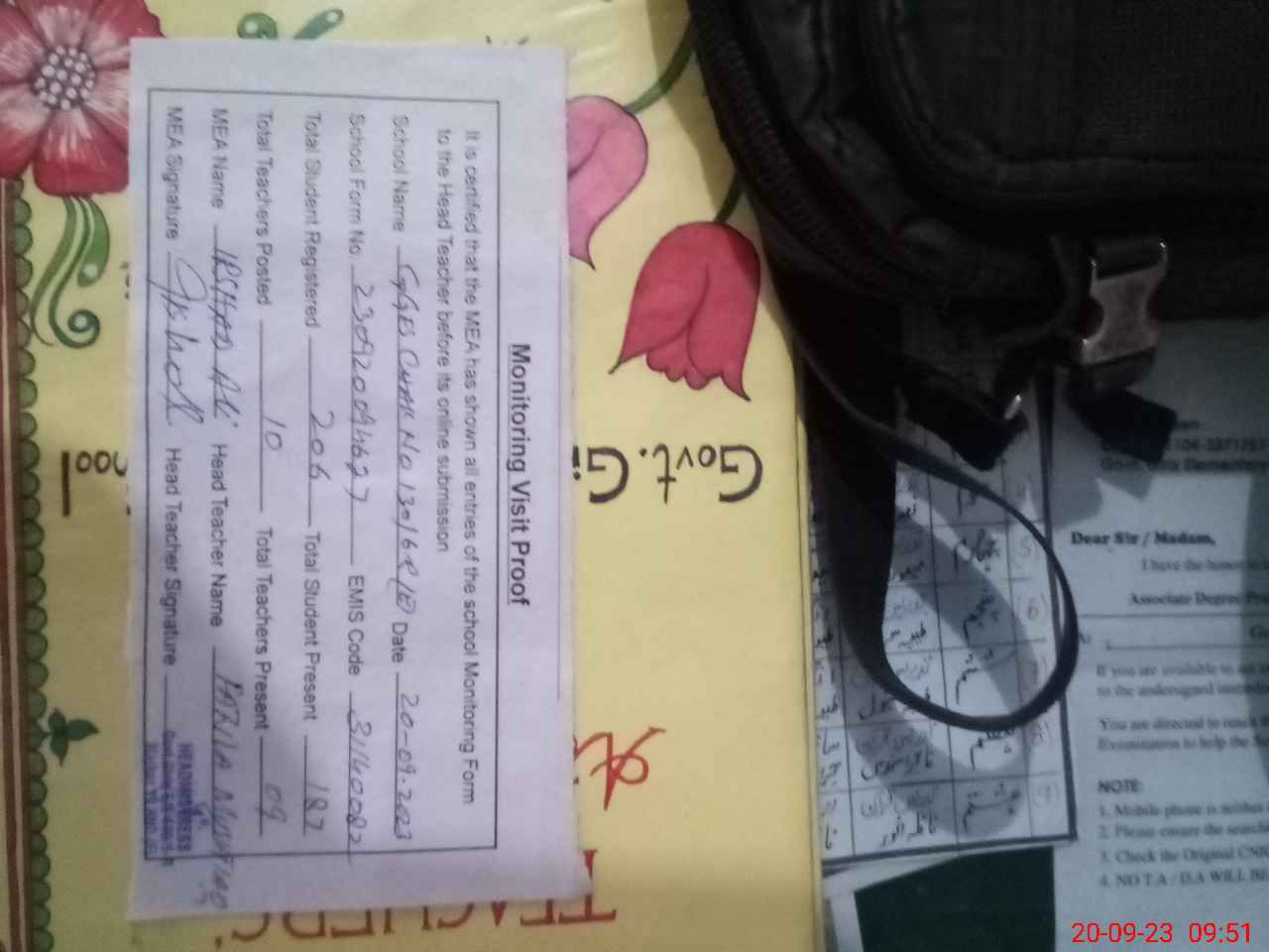 | Attendance Register | Head Teacher | MEA with School | Visit Proof |