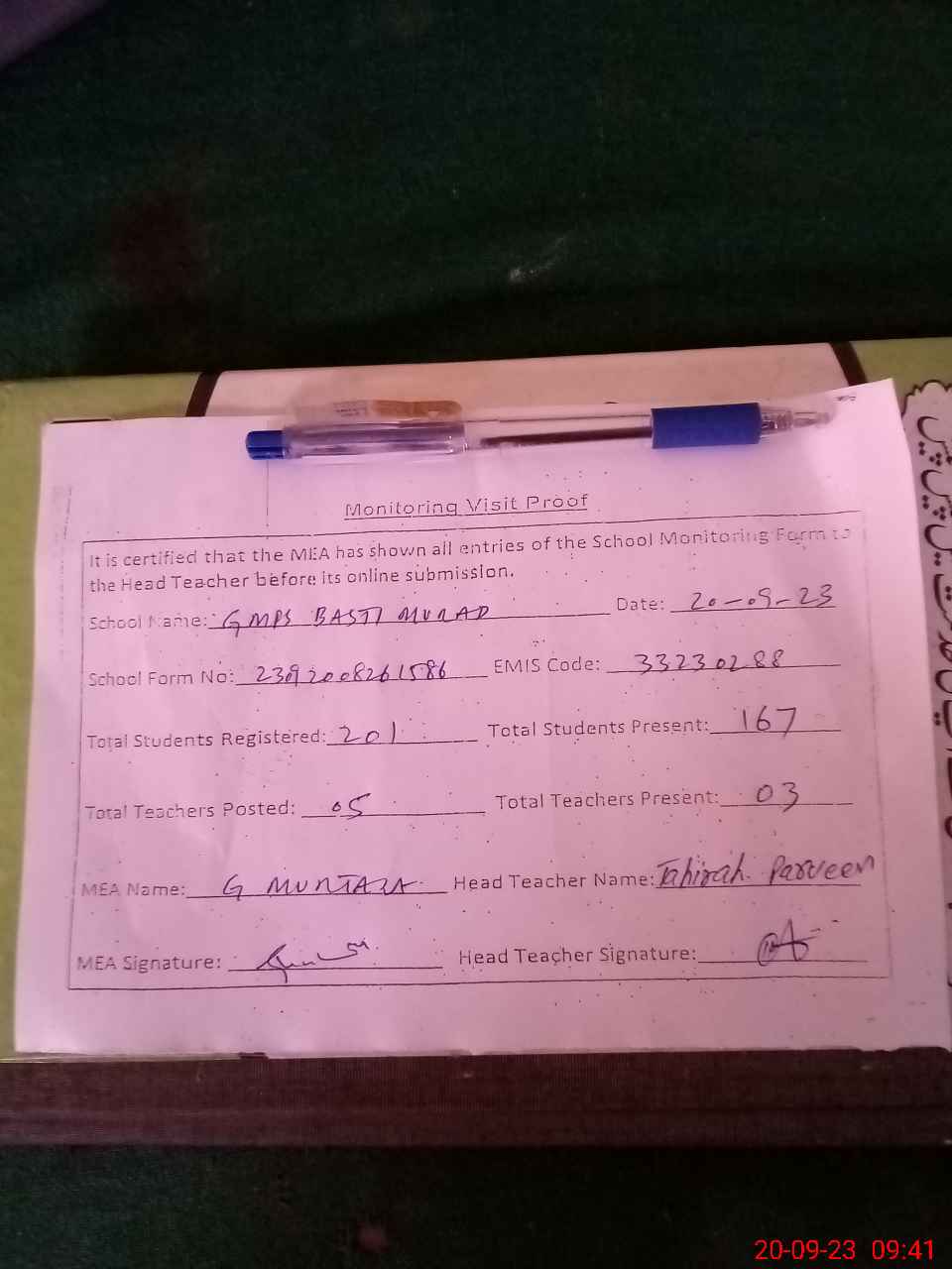 | Attendance Register | Head Teacher | MEA with School | Visit Proof |
